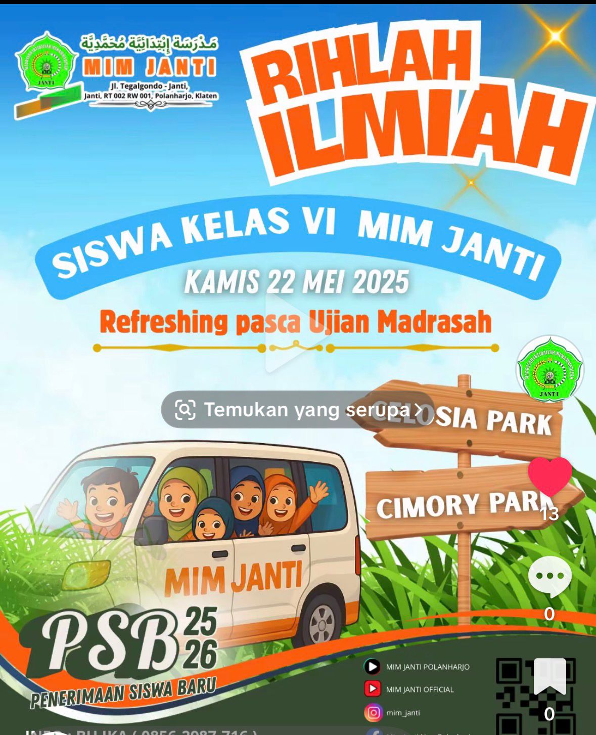 Menjelang kelulusan, siswa-siswi kelas 6 MIM Janti Polanharjo mengikuti kegiatan Rihlah Ilmiah yang dilaksanakan di Celosia Park dan Cimory, pada akhir tahun pelajaran 2024/2025.